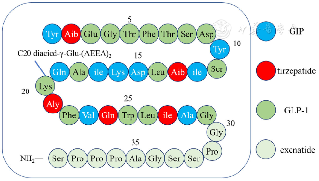 注:不同的顏色表示每個(gè)殘基的來源;GIP=葡萄糖依賴性促胰島素多肽,tirzepatide=替西帕肽,GLP-1=胰高糖素樣肽-1,exenatide=艾塞那肽