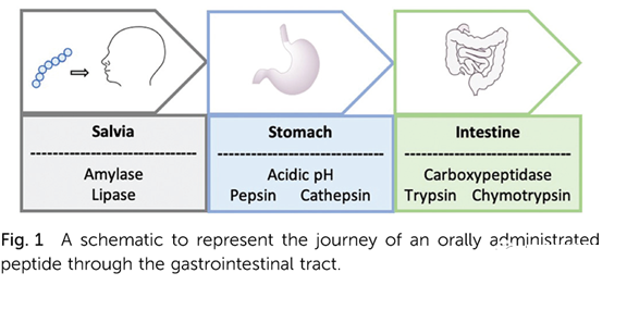 在多數(shù)情況下,口服給藥對于生物制劑和多肽都是一個挑戰(zhàn),藥物從口服到通過胃腸道吸收的整個過程都存在問題。首先,唾液中的淀粉酶和脂肪酶會將多肽分解成更小的分子(圖 1)。